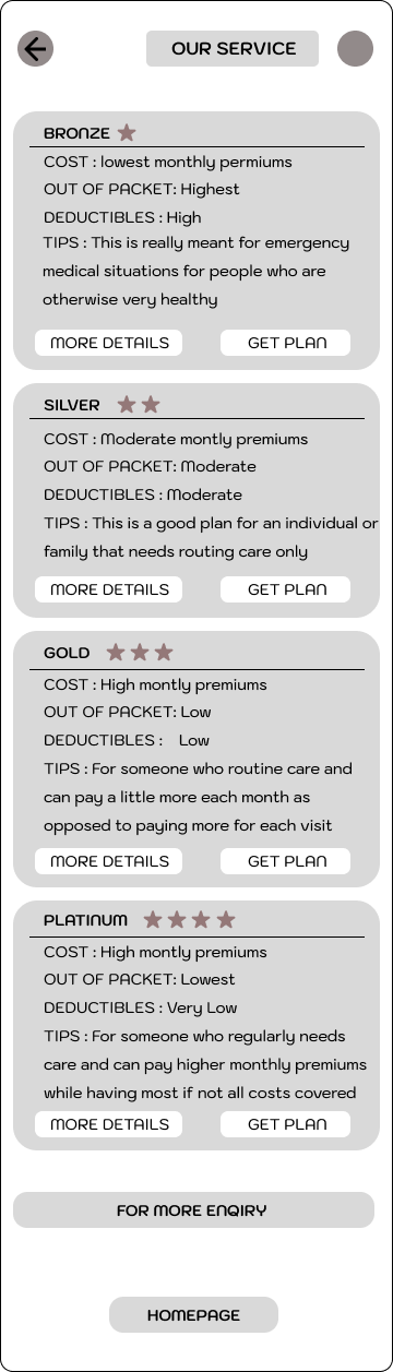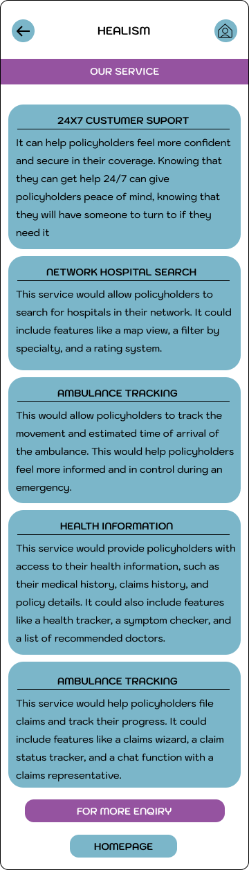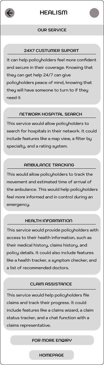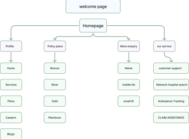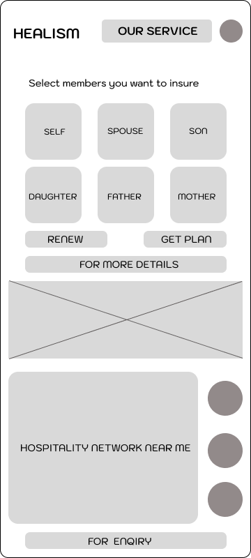 Digital Wireframe for a health insurance app. The app will allow users to manage their health insurance policies, file claims, and access health information.
